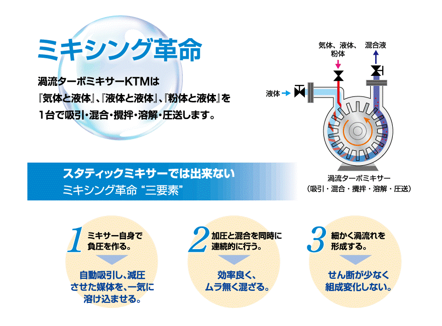 Máy trộn tuabin xoáy KTM có thể thực hiện trộn khí với chất lỏng, chất lỏng với chất lỏng, dạng bột với chất kỏng với 1 chiếc máy bơm duy nhất có thể “trộn”, “khuấy”, “hòa tan” và “bơm”