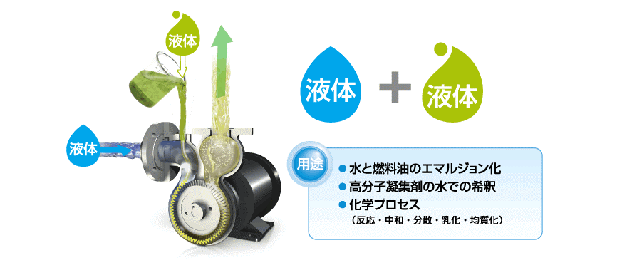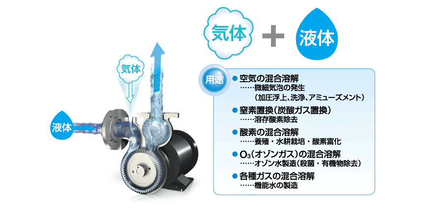 Bằng cách trộn và hòa tan các loại khí khác nhau như oxy, nito, ozone, CO2, khí hydro và clo trong nước, nước biển, chất lỏng hóa học...v.v. Bằng cách sử dụng máy bơm trộn tubin xoáy có thể tạo thêm giá trị mới cho nước và chất lỏng. Đồng thời nó cũng hoạt động trong quá trình tạo nhũ và làm sạch nhiên liệu dạng nhũ tương.